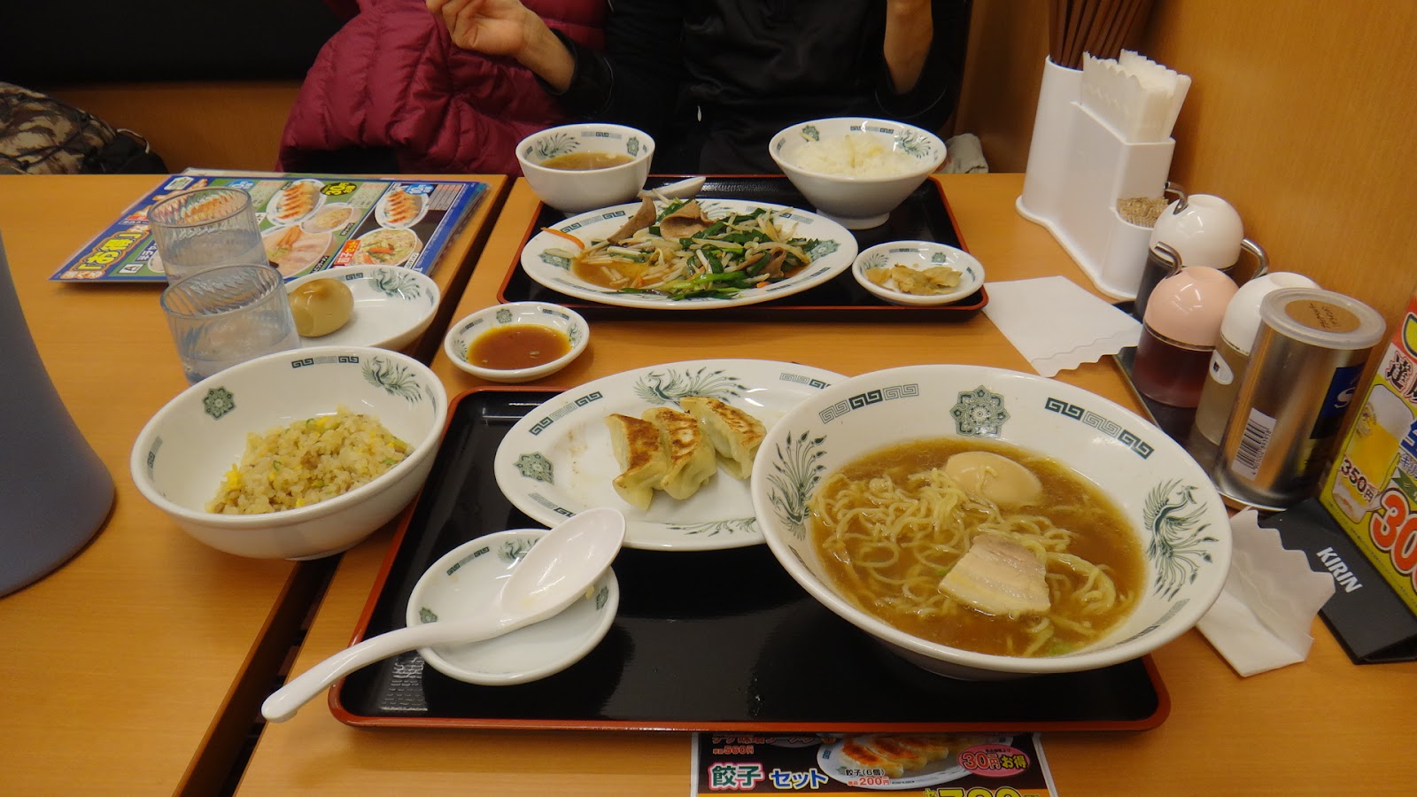 Après le Onsen, on est retourné à la gare, mais on a du attendre 2h parce que le train était stoppé à cause du vent. Certains ont attendu pendant 4h30 assis par terre dans la toute petite gare. Après 2h30 de voyage de retour (heureusement dans le train il fait chaud et on peu dormir) on s'est offert un petit resto chinois parce qu'on avait encore bien faim ! Et voilà, c'est comme dans les albums d'Astérix, on finit toujours par un repas.